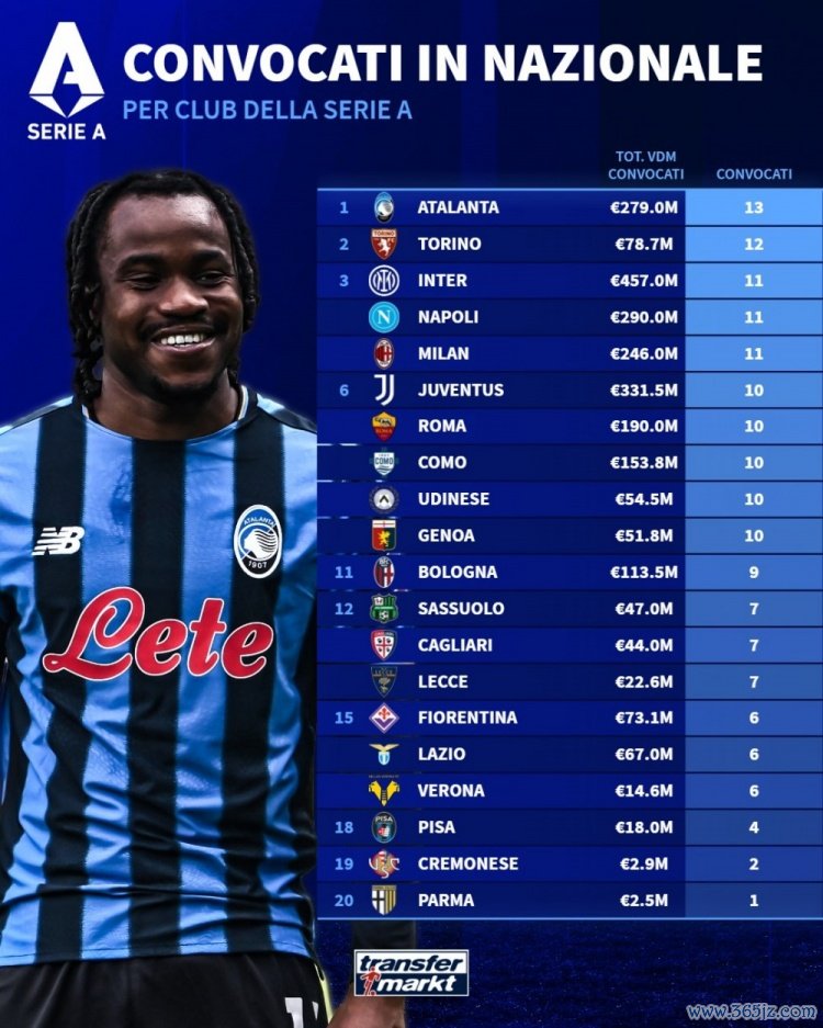 11月12日讯 德国转会市场统计了意甲各队被国家队征召球员的数量,并列出榜单,苏超直播亚特兰大13人居首,都灵12人次席。