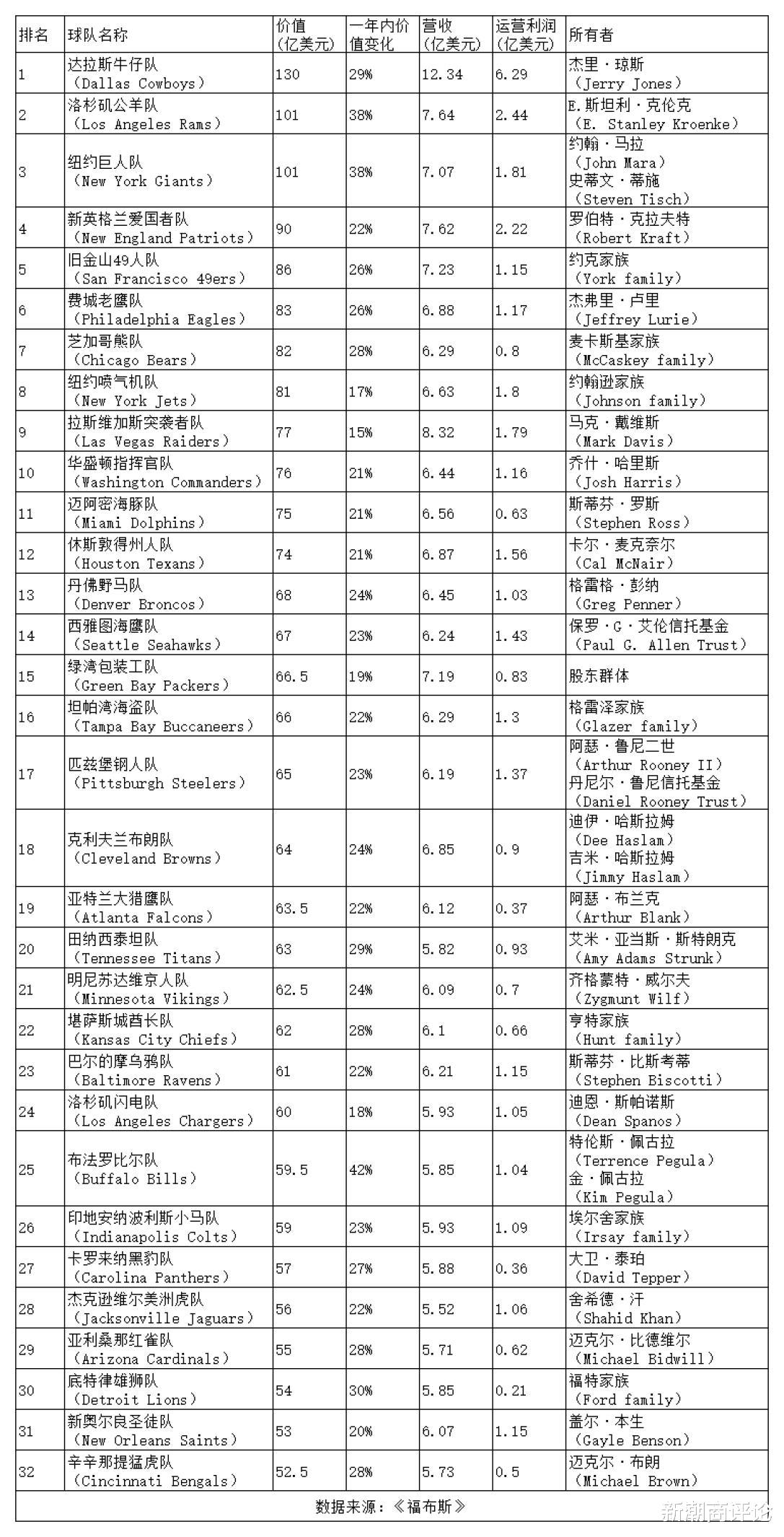 根据《福布斯》估算,32支球队的估值也随之水涨船高,平均估值为71.3亿美元,同比增长25%,较2021年激增104%。“垫底”的辛辛那提猛虎队,估值超过国家冰上曲棍球 联盟(NHL)所有32支球队的估值,也超过美国职业篮球赛 职业联赛 (NBA)和美国职业棒球运动活动 大联盟(MLB)绝大部分球队。