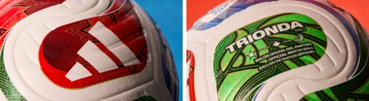 球面图案的设计元素进一步彰显各个主办国特色:星形图案代表美国、枫叶代表加拿大、雄鹰代表墨西哥。这些图案不仅以醒目图形呈现在拼片上,也以浅压花形式融入哑光球面,近看时更显细腻考究质感。