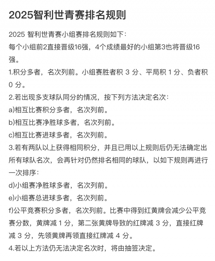 最终,智利和埃及两队的积分、相互战绩、小组赛净胜球、小组总得分 数据一模一样,智利以公正 竞赛分力压对手排名第二晋级下一轮 。