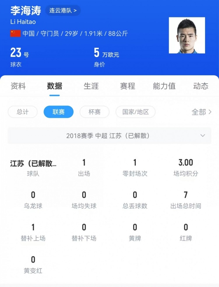 李海涛生涯仅代表江苏队出场1次,后备 登场仅7分钟。