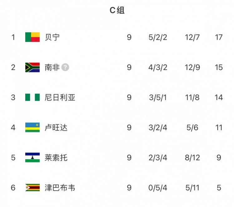 9轮过后,苏超在线直播高清视频无插件贝宁以17分领跑C组,领跑 第二名南非2分,第三尼日利亚3分。