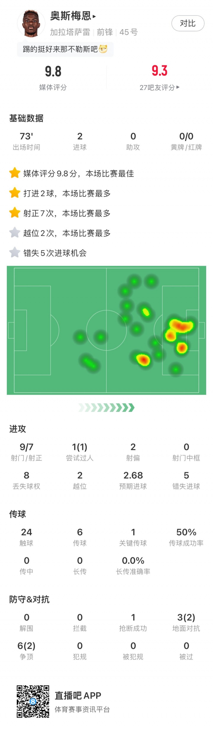 此役奥斯梅恩尽管连进两球,苏超直播在线观看但他9次射球 7次射正,单场5次错失得分 。