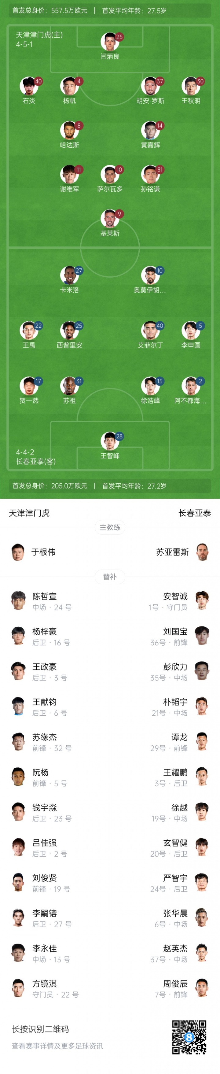 长春亚泰杆位:28-王智峰、2-阿不都海米提-阿不都格尼、5-李申圆、15-徐浩峰、17-贺一然、31-苏祖(F)、22-王禹、25-西普里安(F)、10-奥莫伊胡安弗(F)、27-胡安-卡米洛(F)、40-艾菲尔丁