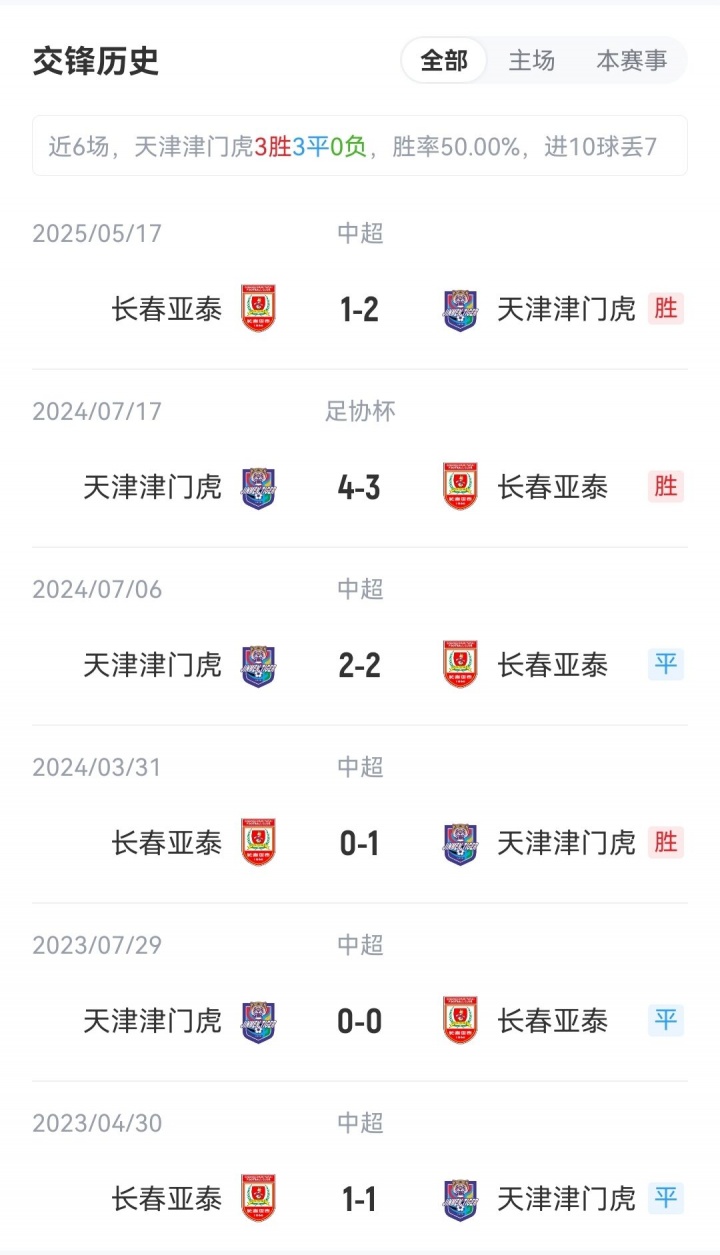 两队在上轮赛事 中均输球,在最近6次交手中,津门虎3胜3平保持不败。