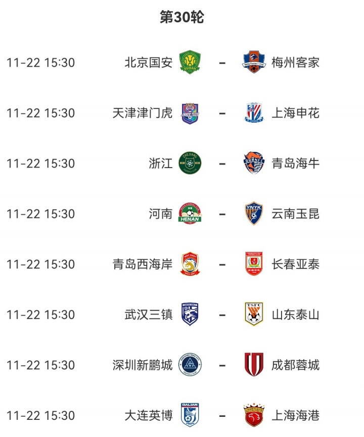 如果今天未能决出第一名 ,悬念就要留到11月22日中超最后一轮才揭晓,届时8场赛事 将同时在15:30开球。