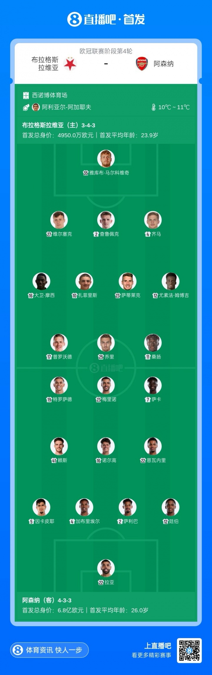 阿森纳欧冠3轮全胜积9分暂位第4,职业联赛 8胜1平1负积25分位居英超榜首,各项赛事收获九连胜;布拉格斯拉维亚欧冠2平1负积2分暂位第28,职业联赛 8胜6平积30分位居捷甲榜首,各项赛事近6场不败。