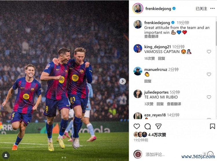 德容社媒晒出与莱万庆祝得分 的合照,配文:“球队展现了很棒的态度,收获一场重要的获胜 。”