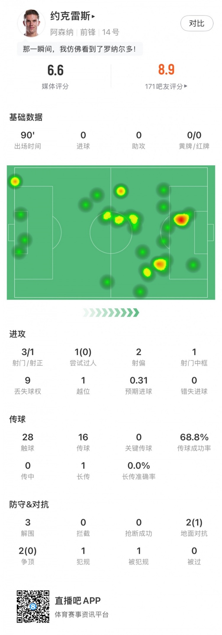 本场赛事 约克雷斯为枪手杆位踢满全场,出任球队的攻击 桥头堡,同时还积极加入 防卫 ,赛后他获得了6.6分的全场评分。